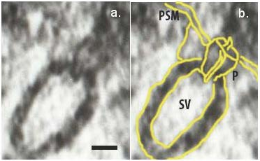 Docked synaptic vesicles (SV) at the base of a cup-shaped neuronal ‘porosome’ complex (P) in the presynaptic membrane (PSM) of the nerve terminal (Bar = 10 nm)